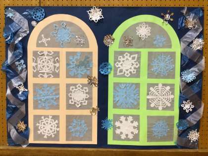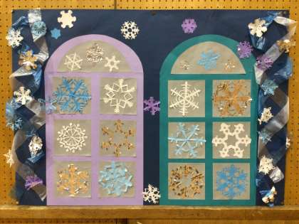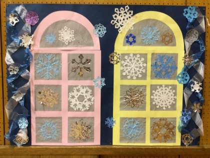 4年生が「冬」をテーマに制作しました。色とりどりな雪の結晶が、カラフルな窓枠に散りばめられています。ビニール紐も効果的に使用されています。