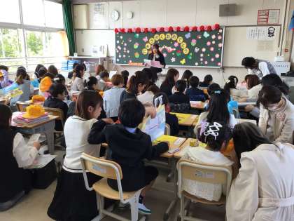 入学式後の1年生学活の様子です。担任の先生のお話をよくきいて、たくさんの荷物の確認をしました。