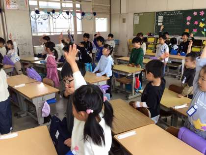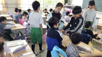 6年生が朝の準備を手伝ったり、交通安全教室の練習をしたり、読み聞かせを聞いたり、どの子も泣かずに真剣。小学校生活が始まりました。