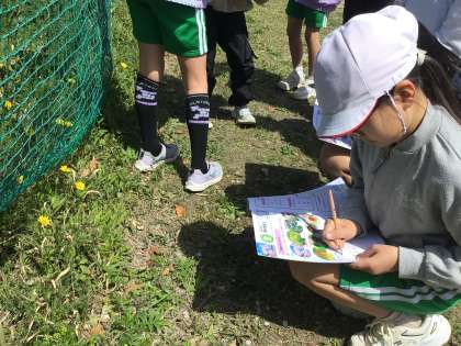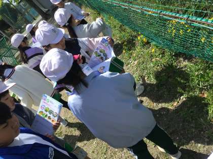 4年2組の授業の様子です。校内の生物を探しました。名前がわからない生物を、自分たちですすんで学習用タブレットを使って調べるなど、意欲的に取り組むことができました。
