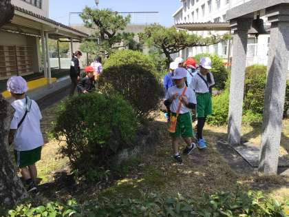3年生が始まって、新しく加わった教科に理科があります。「どんな授業をするのかな?」と期待と不安でいっぱいだった3年生。最初の理科の授業は自然観察です。本校の庭園を活かして、宝探しと称した自然観察の基礎を学びました。植物や小さい生き物を見つけるために、地面ばかりではなく、あらゆる方向に目を向けることが大事であることを実体験で学ぶことができました。(画像1)