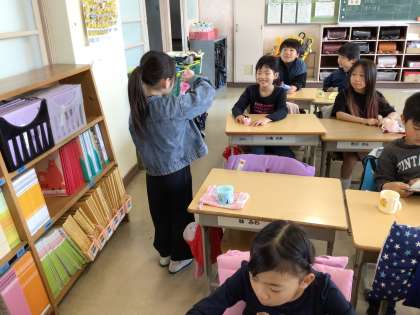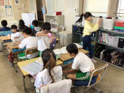 毎週木曜日にフッ化物洗口を実施しています。保健係さんがクラスメイトに液体を配ってくれています。とても助かっています。いつもありがとう!