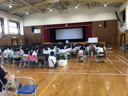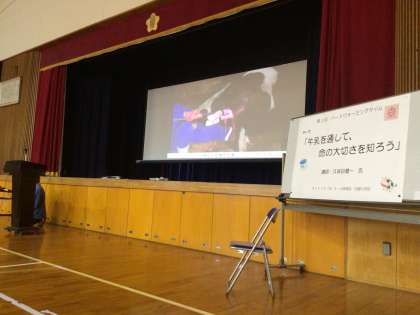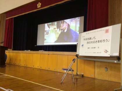 牛の出荷のシーン、牛の出産の時、雌牛が苦労して時間をかけて子牛を産んでいるビデオを見ました。その後、「食」「命」の漢字の成り立ちから命をいただくという意味や、動物を世話をするということの責任について話を聞きました。涙を流して話を聞く児童がたくさんいました。