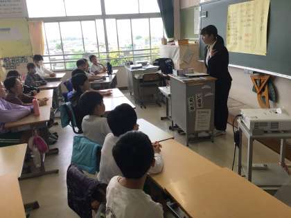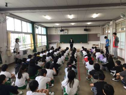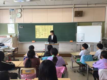 主に保健室、5年1組で観察や実習などを行います。写真は、5年1組、5年生の前であいさつをしている様子です。