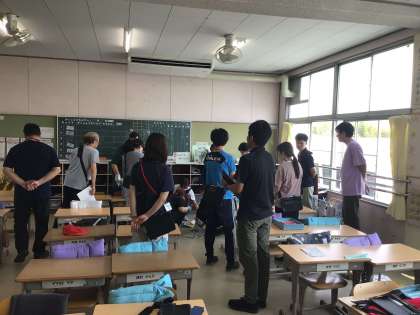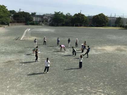 子どもの下校後、緊急対応シミュレーション研修「嘔吐物、熱中症対応訓練」を行いました。嘔吐物処理実習と、重度の熱中症対応のシミュレーションをしました。実際に119に電話したり、担架を使って傷病者を運んだりしました。