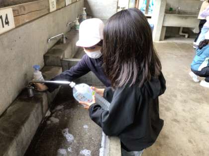 手洗いもペットボトルに入れた水で洗います。どれくらい水が必要か調べながら、手を洗っていました。