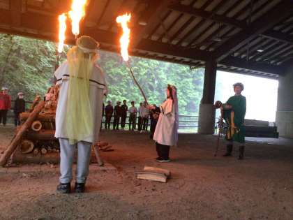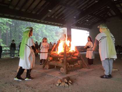 キャンプファイヤーが始まりました。火の神様、精霊たちの話の後、精霊たちが点火してくれました。