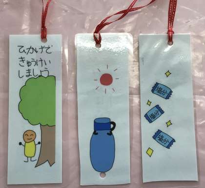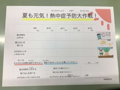 保健委員会で熱中症予防のための行動を学ぶことを目的に、「夏も元気!熱中症予防大作戦!」を企画しました。朝ごはん、睡眠、水分補給のチェックシートを作成し、各クラスにポスターも貼りました。良い成績だった子向けにしおりを作りました。