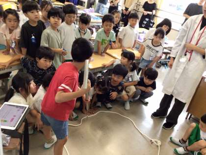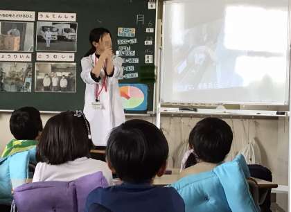3時間目は、栄養教諭から給食作り方や携わってくれている人を教えてもらいました。実際に給食センターで使っている道具を持たせてもらいました。一年生には重かった。