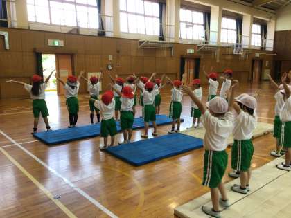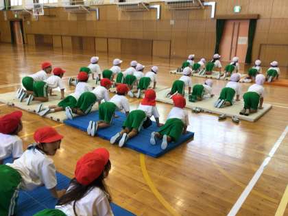 「せーの!」みんなで、掛け声をかけて安全に気をつけてマットを準備できました。前転にも挑戦!