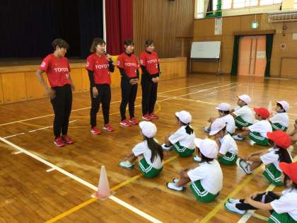 7月10日(木)にトヨタレッドテリアーズの選手、4名に来ていただいて、ボール投げ教室が行われました。