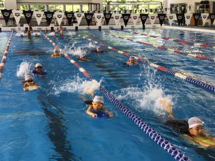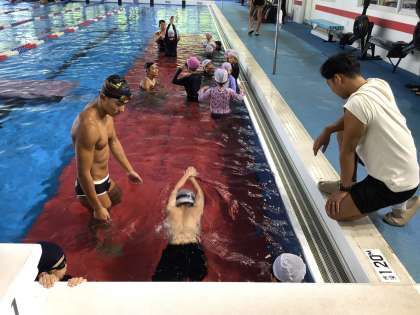 2回目。グループに分かれてレッスンを受けました。その前に、中京大学水泳部の選手によるデモンストレーション。オリンピック候補の泳ぎに圧倒されました。その選手たちに教えてもらえる児童は、幸せですね。