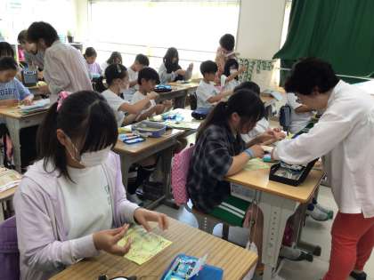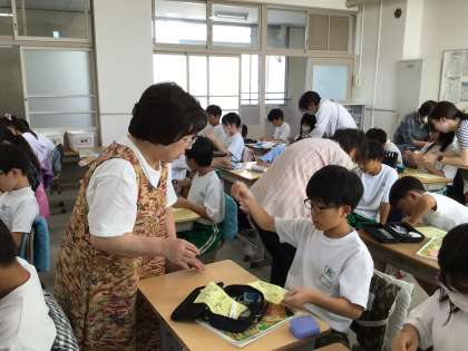 今日のクラスも針に糸を通すところから四苦八苦。4名のボランティアのご指導のおかげで玉留め、玉結び、ちょっとずつ慣れてきたようです。