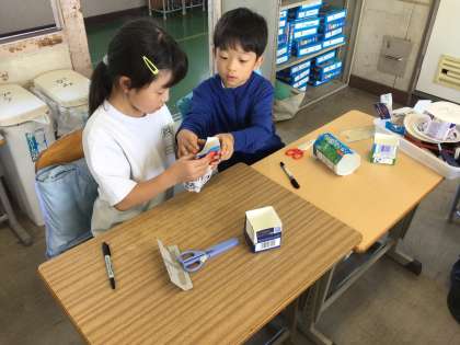 おもちゃ作り 公開日 2025/09/26 更新日 2025/09/26 各学年から ものづくりサポーターの方々に来ていただいて、「ことこと車」と「ストローダーツ」を作りました。1本の牛乳パックから、2つのおもちゃを作ることができて、驚きと喜びでいっぱいでした。 体育館で、ことこと車を走らせたり、的めがけてダーツを飛ばしたりしました。とても楽しく遊びました。