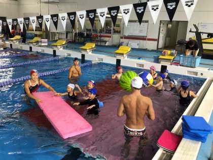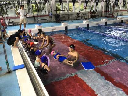 だるま浮きや鼻から息を出すことができるかテストをしました。最後はいつもの通り自由時間。広いプールで大学生と一緒に楽しみました。
