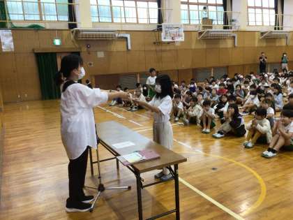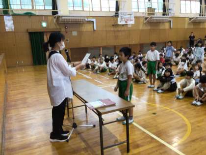 写真はあいさつ賞の様子です。前期あいさつが素敵だった「高町1」「下古屋5-1」を表彰しました。これからも、学校・地域で明るいあいさつを響かせる四郷っ子に期待します。