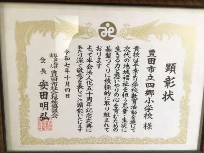 地域福祉への取組が認められ、社会福祉協議会から顕彰状をいただきました。集会の中で、児童代表に顕彰状を渡しました。