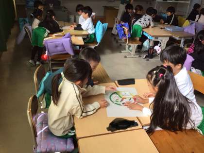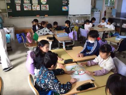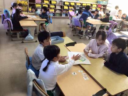 食に関する指導で赤、緑、黄色のグループとその栄養について学びました。グループの子で相談しながら、りっちゃんのサラダに出てくる食材がどの色のグループになるか考えました。