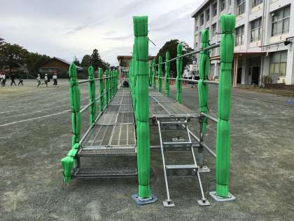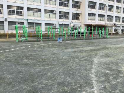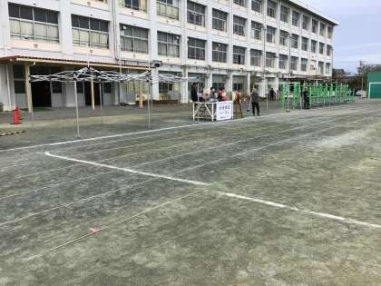 今年は立ち見席をコーナーぎりぎりに設置しました。学年部ごとに入れ替えです。(低学年、中学年、高学年で)2基設置しましたが、定員は1基60名ほどです。希望される保護者には事前に並んで頂きますので、ご協力お願いします。