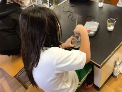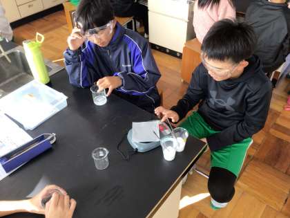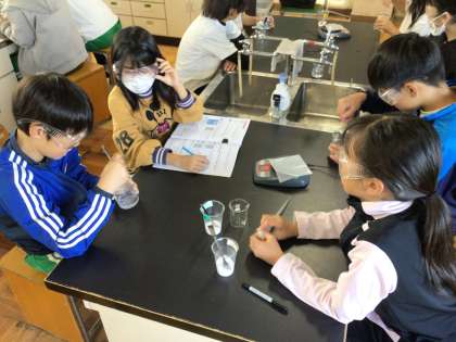 5年生は、単元「もののとけ方」を学んでいます。写真は、2組が水にとけるものの量に限りがあるかどうかの実験をしている様子です。集中してかくはんし、食塩やミョウバンを溶かそうとしていました。