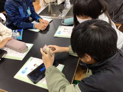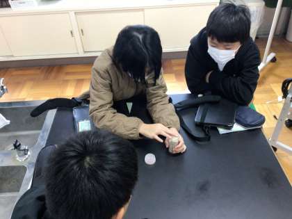 6年2組の様子です。単元「土地のつくりと変化」について学んでいます。今日は、四郷小学校のボーリング資料を見たり触ったりすることで、色や粒の大きさのちがいに着目して学びを深めました。