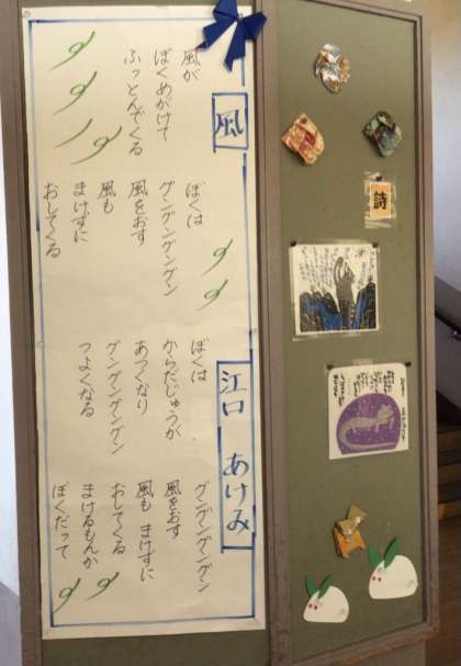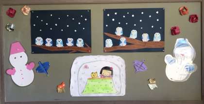 クリスマスから冬の様子に掲示が変わりました。いろいろなアイディアがポンポン出てきてびっくりします。家庭で飾りをつくってくださるボランティアの方もいます。本当にありがとうございます。