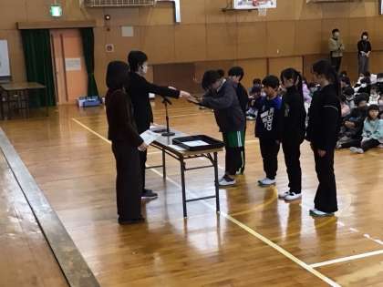12月のあいさつ賞と、俳句大会や赤いはねコンクールの表彰がありました。
