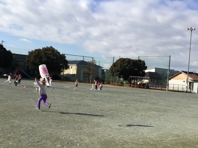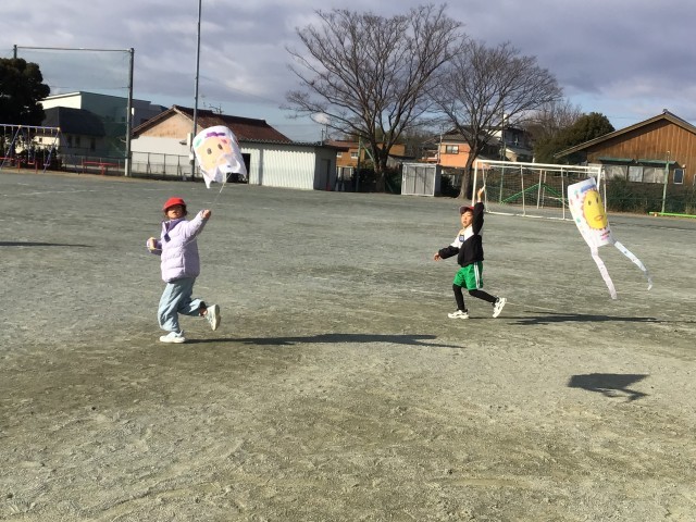 吹く風がとても冷たい中、子ども達は元気に凧揚げをしました。初めはなかなか上がらなかったけど、最後は全員高く飛びました。