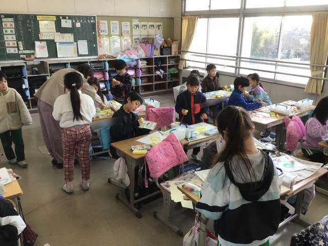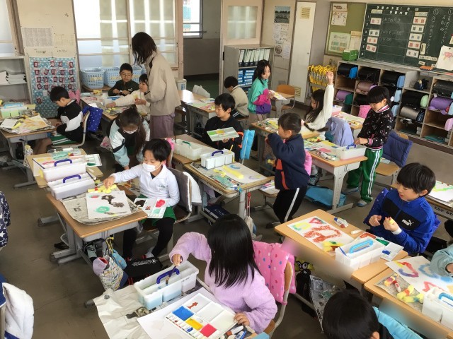 絵のもとになるシールを丁寧に切って、台紙に貼り、スポンジで絵の具をぽんぽんしながら、ステンシル版画をしています。