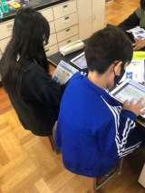 6年生の理科授業の様子です。学習用タブレットの発表ノートを使って、実験器具の使...