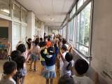 各学年でまとまり、ドローンで撮影しました。1年生は、廊下に並び笑顔で手を振りまし...