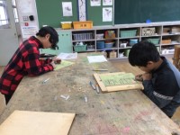 図画工作科で「木版画」の授業の様子です。いよいよ、彫る工程に入りました。下描き...