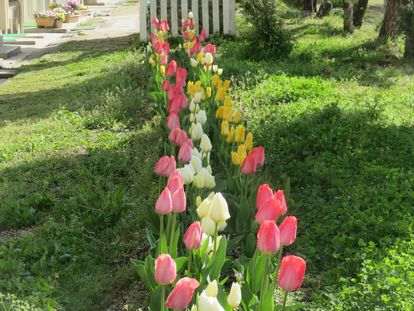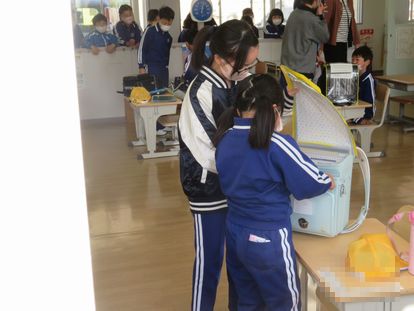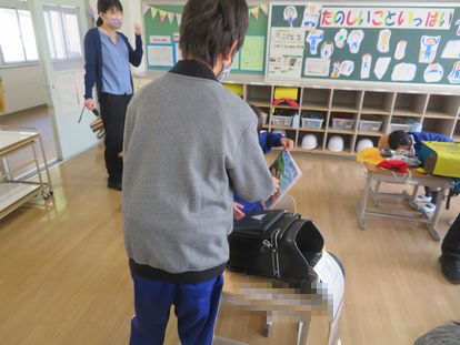 学校2日の朝、2,3年生が植えてくれたチューリップが満開です。1年生の教室をのぞくと、手洗いのあと、距離を気をつけながら登校後の準備を6年生の子どもたちが1年生に教えてあげていました。