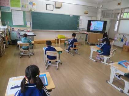今日から土日をはさんで学習用タブレットの持ち帰りを行います。今回は課題を学年ごとで行います。先週、学習用タブレットを初めて使用した1年生。今日も授業で学習用タブレットを使って絵本を読んでいて楽しそうでした。
