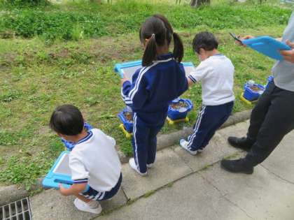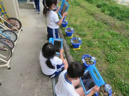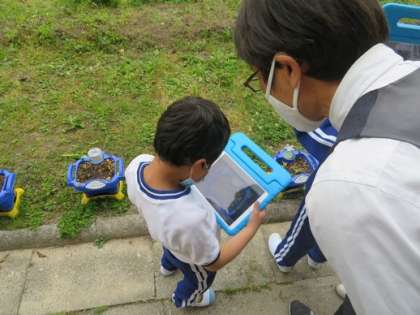 1年生の子どもたちが学習用タブレットを使用して、朝顔の観察をしていました。芽が出たことがうれしそうで、撮った写真を先生に見せて話をしていました。