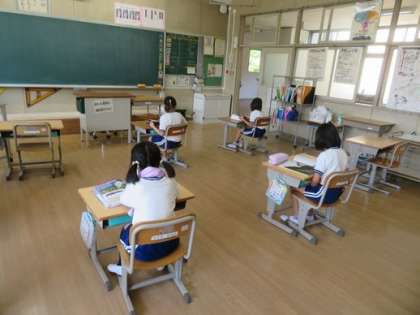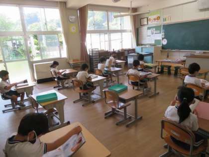 朝活動の時間、水曜日は1年生〜3年生は読書、4年生〜6年生は学習でした。1年生から3年生の子どもたちは、自分の好きな本を集中して読んでいました。本が好きな敷島っ子たちです。