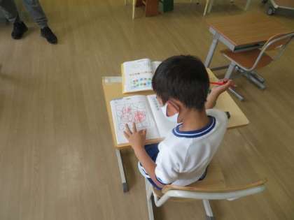 入学して2か月と少し、1年生の子どもたちは落ち着いて学習をしていました。今日は算数で2つの数を合わせて9になるものを考えていました。