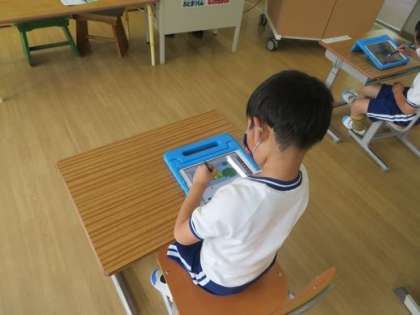 1年生の算数の学習が「ひき算」に入りました。学習タブレットを使って「島にいたカエルが移動しました・・・」という操作を学習用タブレットを使って勉強していました。学習用タブレットの使い方も慣れてきました。