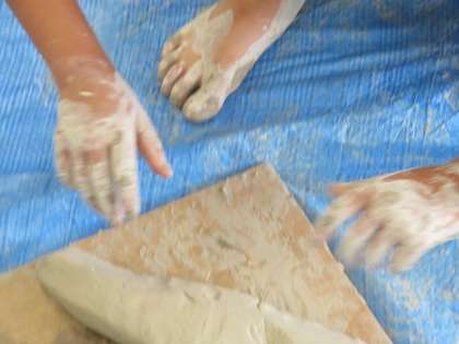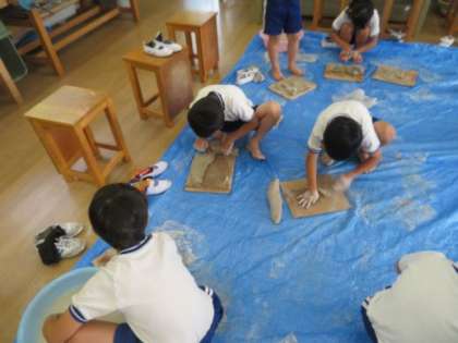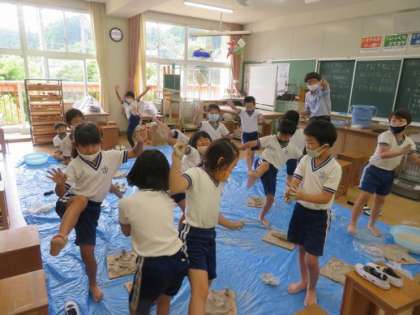 2年生が土粘土を使って授業を行っていました。最初に土粘土の感触を楽しもうと手で触ったり、足で踏んだりしていました。そして、形をつくったり、粘土が乾くとどうなるのかを体感したりと、笑顔いっぱいで授業に取り組んでいました。