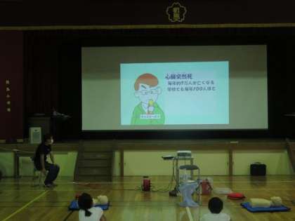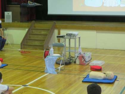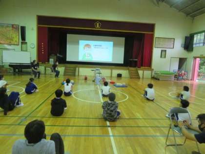 5年生、6年生の子どもたちを対象に本日5時間目、6時間目を使って「応急手当講習」の学習を消防署の方を講師に迎え行いました。AEDの使い方などをビデオや体験活動をしながら学びました。万が一のときに救える命を救うための学習です。