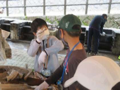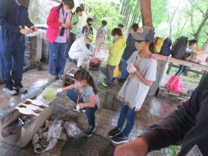 本日、5年生の林間学校がありました。稲武小、小渡小の5年生ともすぐに仲良くなり雨の中でしたが楽しむことができました。最初の学校紹介は、すばらしい脚本で劇風に敷島小学校を紹介していました。そのあとのクラフト、五平餅づくりも班のみんなと一緒に作っていました。最後のウォークラリーは雨の中でしたがみんながんばりました。