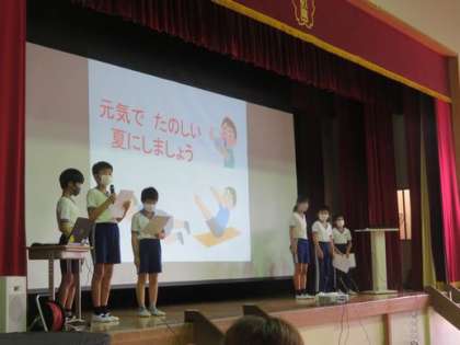 今日は学校保健員会。「姿勢と健康」について学習しました。最初はPTAアンケートの結果発表、次に健康委員会の子どもたちの発表、その次に足助病院の理学療法士の方に講師に迎え「姿勢をよくしよう」という演題でお話をしていただきました。そして、最後に夏休みの「チャレンジ目標について」親子で相談をしました。姿勢、運動に気を付けて夏休みを過ごしてほしいです。