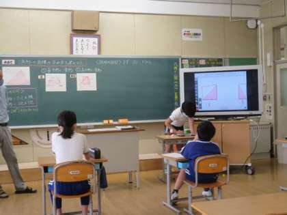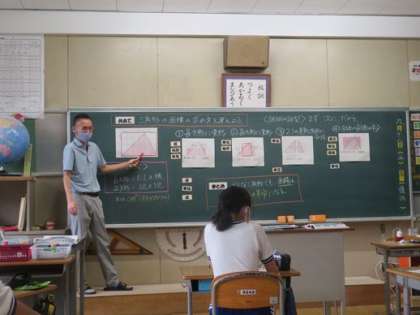 5年生の算数の「三角形の面積の求め方」の授業を参観しました。自分たちが考えたやり方を見て、「このやり方で似ているところある?」の発問に子どもたちは「直角三角形の考え方に似てる」「全部長方形で考えている」「長方形の半分になっている」・・・と考えを深めていました。次の時間は「三角形でもっと簡単に求められないかな?」「公式にできないかな?」と進みそうです。