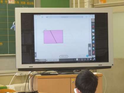5年生で平行四辺形の面積を求める授業を行いました。子どもたちはいろいろなやり方を学習用タブレットを操作しながら考えました。教師側が思いつかなかった解答もありました。8通りの考え方、よく考えましたね。