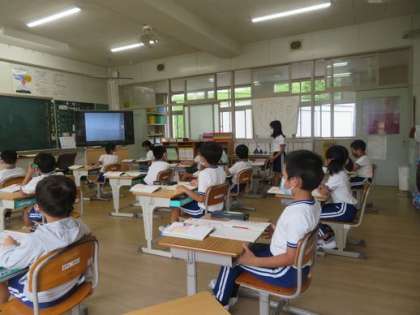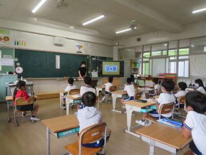 2年生では九九の勉強に入っています。みんな一生懸命に覚えようとがんばっています。最後は学習用タブレットを利用して、それぞれ練習をしていました。