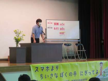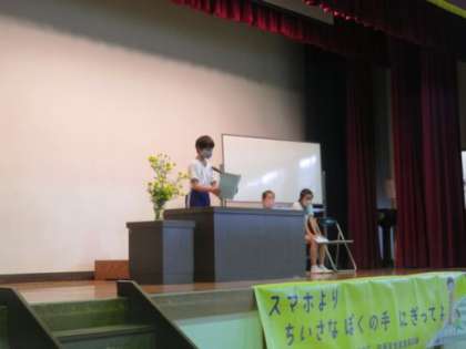 本日、5時間目に学期切替式を行いました。JRC青少年赤十字リーダー研修会に参加した5年生代表者からの報告、2,4,6年生の代表児童の「前期の振り返りと後期がんばりたいこと」の発表、校長の話を行いました。代表児童の発表はどれも内容もよくすばらしいものでした。