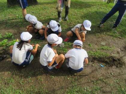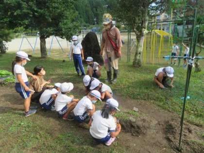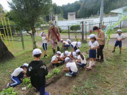 2年生の子どもたちが生活科の授業で野菜作りの名人を招いて、野菜の間引きについて学んでいました。大きな野菜に育てるために必要な間引き。子どもたちは楽しんでやっていました。