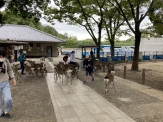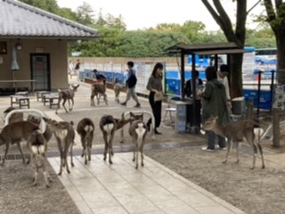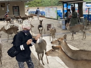 南大門の前、鹿せんべいを購入した子どもたち。シカと楽しそうに遊んでいました。