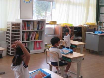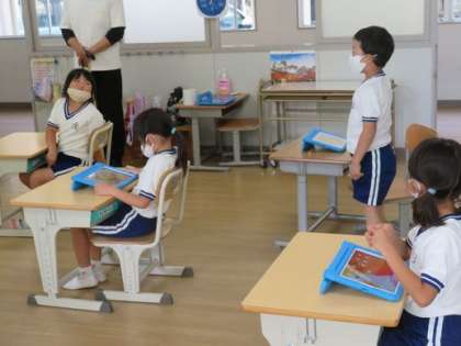 1年生が生活科で収穫したサツマイモ料理の紹介をしていました。家で学習用タブレットで写真や動画を撮影し、それを使って説明をしていました。発表のあとに友達からの質問や感想を受けてそれに答えていました。おいしそうな料理ができたようです。