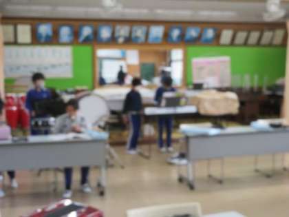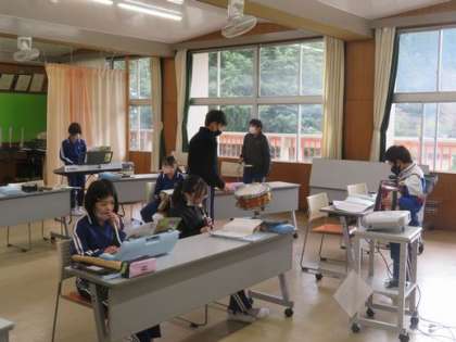 教室を回ると5年生、6年生の音楽が合奏をしていました。コロナ感染も落ち着きを見せています。音楽の授業の内容も距離をとる等の対応はしていますが、音楽室での合奏練習も行っています。子どもたちは演奏を楽しんでいました。